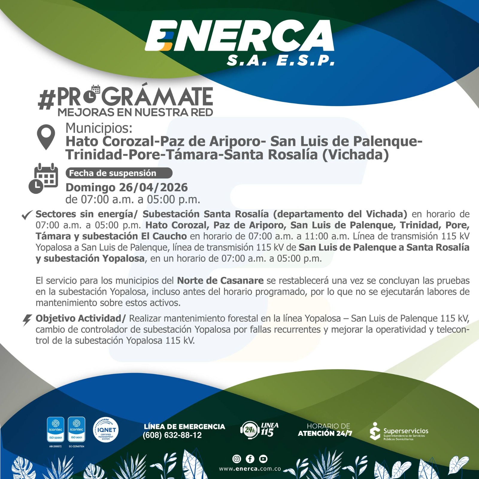 Atención Casanare! Masiva jornada de mantenimientos eléctricos dejará sin luz a 14 municipios Enerca anuncia cortes programados entre el 26 y el 29 de abril en gran parte del departamento y Santa Rosalía (Vichada). La Empresa de Energía de Casanare, Enerca S.A. E.S.P., informó que durante los últimos días de