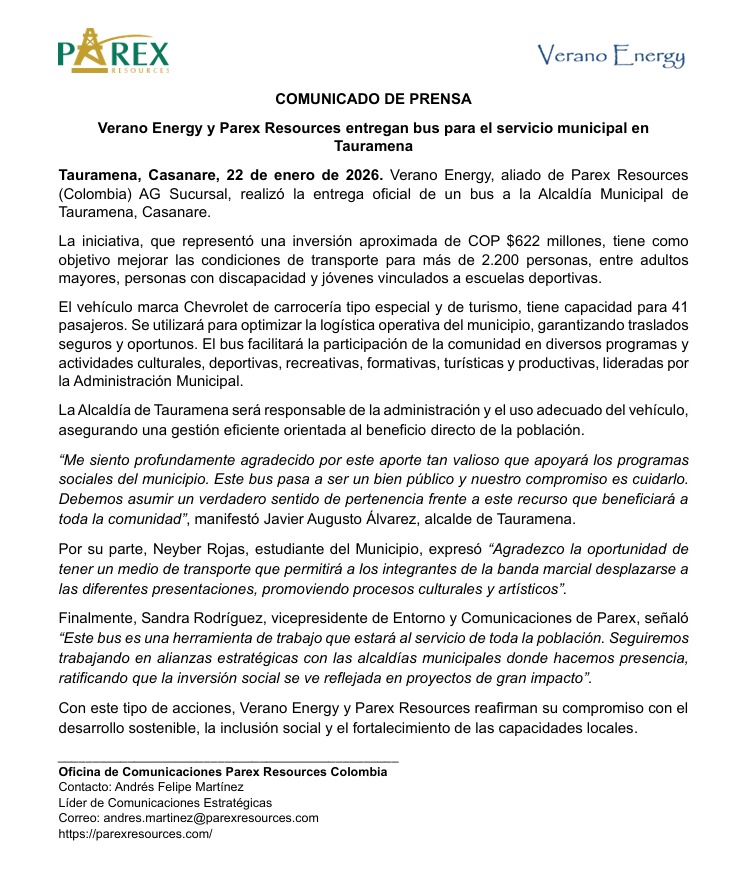 Verano Energy, aliado de Parex Resources (Colombia) AG Sucursal, realizó la entrega oficial de un bus a la Alcaldía Municipal de Tauramena, Casanare.